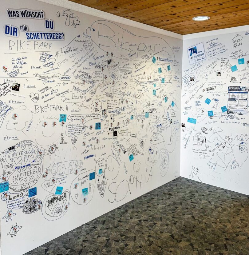 Besonders eindrucksvoll zeigte sich der Zukunftswille an der Wünsche-Wand unter dem Motto “Was wünschst du dir für Schetteregg?”. Dutzende Kinderzeichnungen und zahlreiche Botschaften von Erwachsenen machten klar: Der Fortbestand des Gebiets, ein familienfreundliches Angebot und die Weiterentwicklung mit Sommerbetrieb stehen für viele ganz oben.