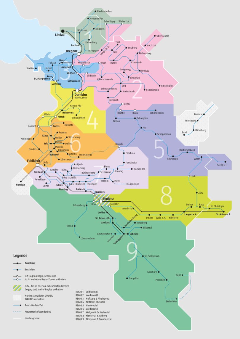 Die insgesamt neun Regio-Zonen umfassen die Orte und Bereiche der bekannten Regionen des Landes und erweitern damit den Mobilitätsradius. Wichtige Orte und Städte liegen an den Rändern der REGIOS und sind als Überlappungsbereiche damit aus mehreren REGIOS mit nur einem Ticket gut und günstig erreichbar. Aus Andelsbuch kostet beispielsweise eine Einzelfahrt nach Bregenz aktuell 7,80 Euro, nach Dornbirn sind es 5,30 Euro. Mit dem neuen REGIO 2 Vorderwald-Ticket um 4,80 Euro für 60 Minuten sind künftig beide Bezirkshauptstädte im Angebot inkludiert. Um nur 9,20 Euro ist man ganze 24 Stunden flexibel im gesamten REGIO mit Zug und Bus unterwegs: also mit dem Bus nach Bregenz, mit dem Zug weiter nach Dornbirn und von dort flexibel wieder zurück nach Andelsbuch.