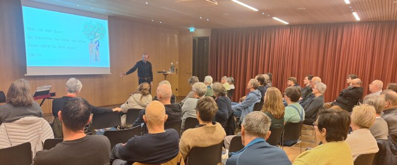 Anschließend erklärte Hauptreferent Christian Broger anhand der Bibel, dass jedes dieser Krisenfelder im Sündenfall der ersten Menschen wurzelt und durch Jesus Christus am Kreuz gelöst wurde.