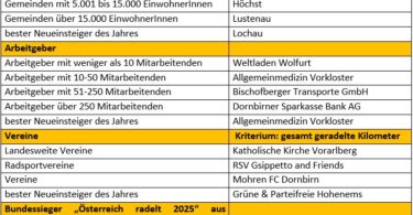 „Ich bedanke mich bei den 59 Vorarlberger Gemeinden, 198 Unternehmen, 21 Schulen und 52 Vereinen, die uns dabei unterstützen, möglichst viele Vorarlbergerinnen und Vorarlberger zum Radfahren zu motivieren“, betont Christof Bitschi. 2025 waren 30 Arbeitgeber, 2 Gemeinden und 11 Vereine „Neueinsteiger“ bei „Vorarlberg radelt“ und damit zum ersten Mal bei der Aktion mit dabei. Die „Vorarlberg radelt“ Community wächst somit weiter.