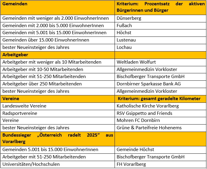 Die Gemeinde Höchst, die FH Vorarlberg und Fa. Bischofberger Transporte haben es zudem erneut ganz an die Spitze geschafft. Sie sind Bundessieger bei Österreich radelt 2025.