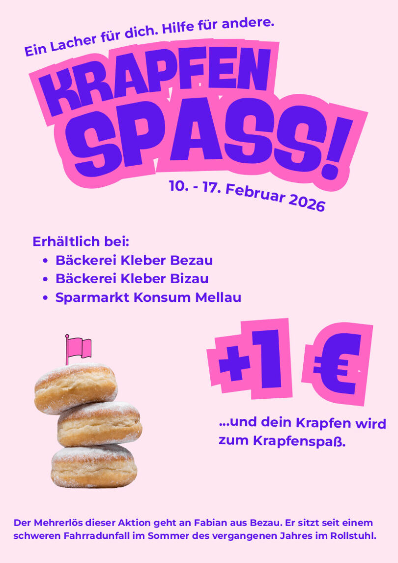 Mit einem kleinen Aufpreis von einem Euro wird aus dem heiß geliebten Faschingskrapfen ein „Krapfenspaß“ – samt Witz, munterem Spruch oder einer kleiner Denksport-Aufgabe. Der gesamte Mehrerlös geht an Fabian aus Bezau. Seit einem schweren Unfall im vergangenen Jahr ist er auf den Rollstuhl angewiesen und wird nun mit dieser sympathischen Aktion unterstützt.