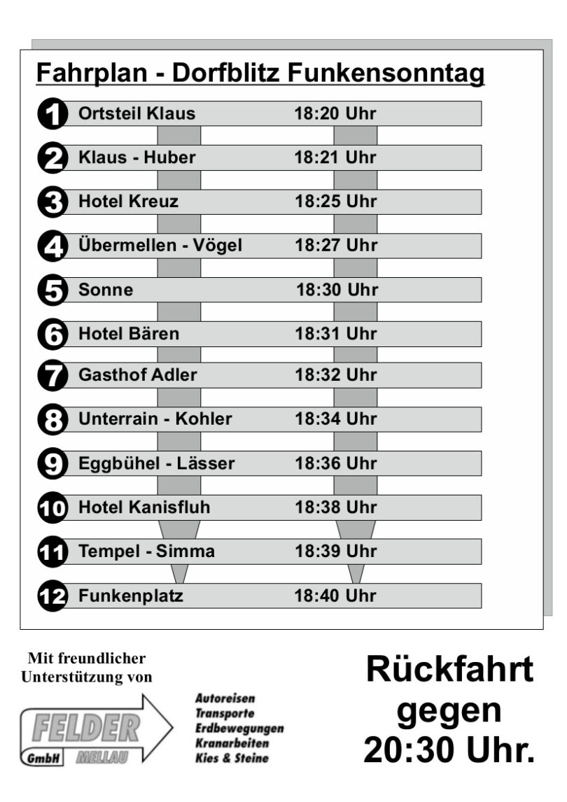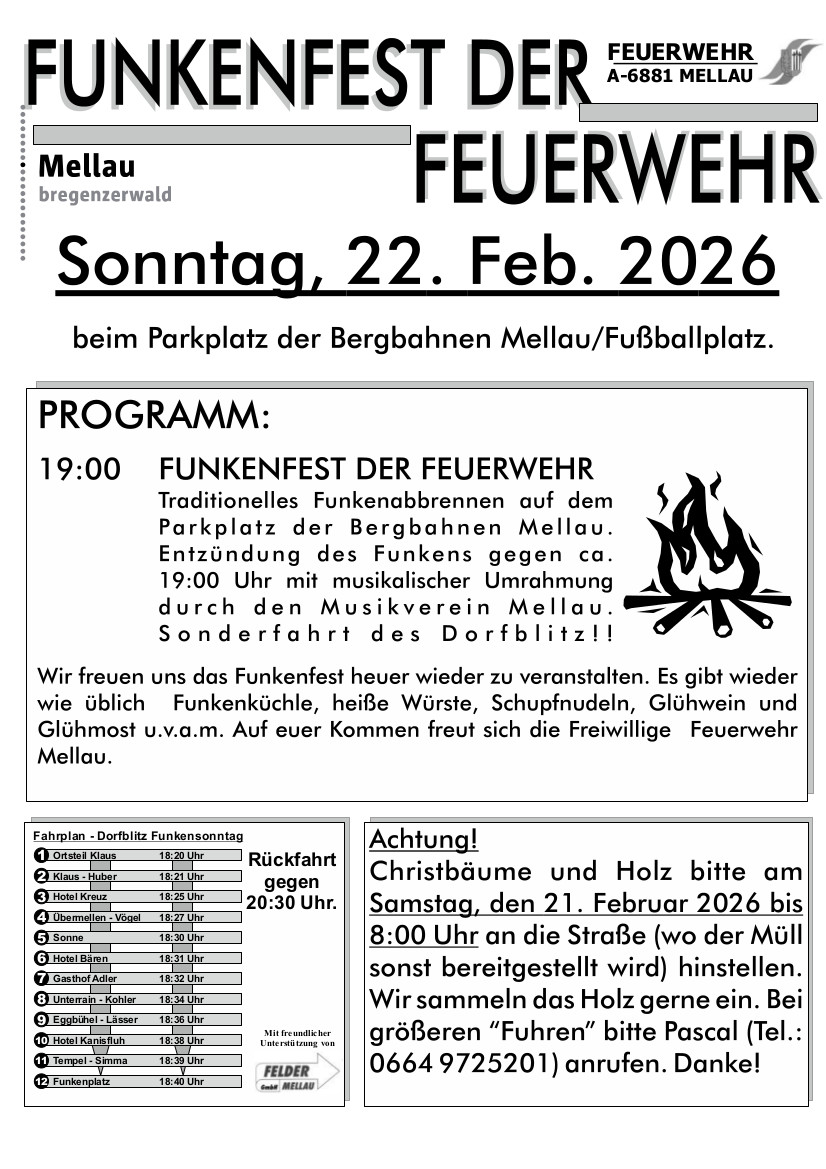 EVENTS Funkenfest der Feuerwehr Mellau am 22. Februar – Alle Infos – Anno 2015: Ein Bericht vom Funken 5 Stunden altKommentar hinzufügen21 Klicks Hier noch ein Bericht von 2015 in pdf (VN/Heimat): FunkenMellau FacebookXGoogle+PinterestLinkedIn