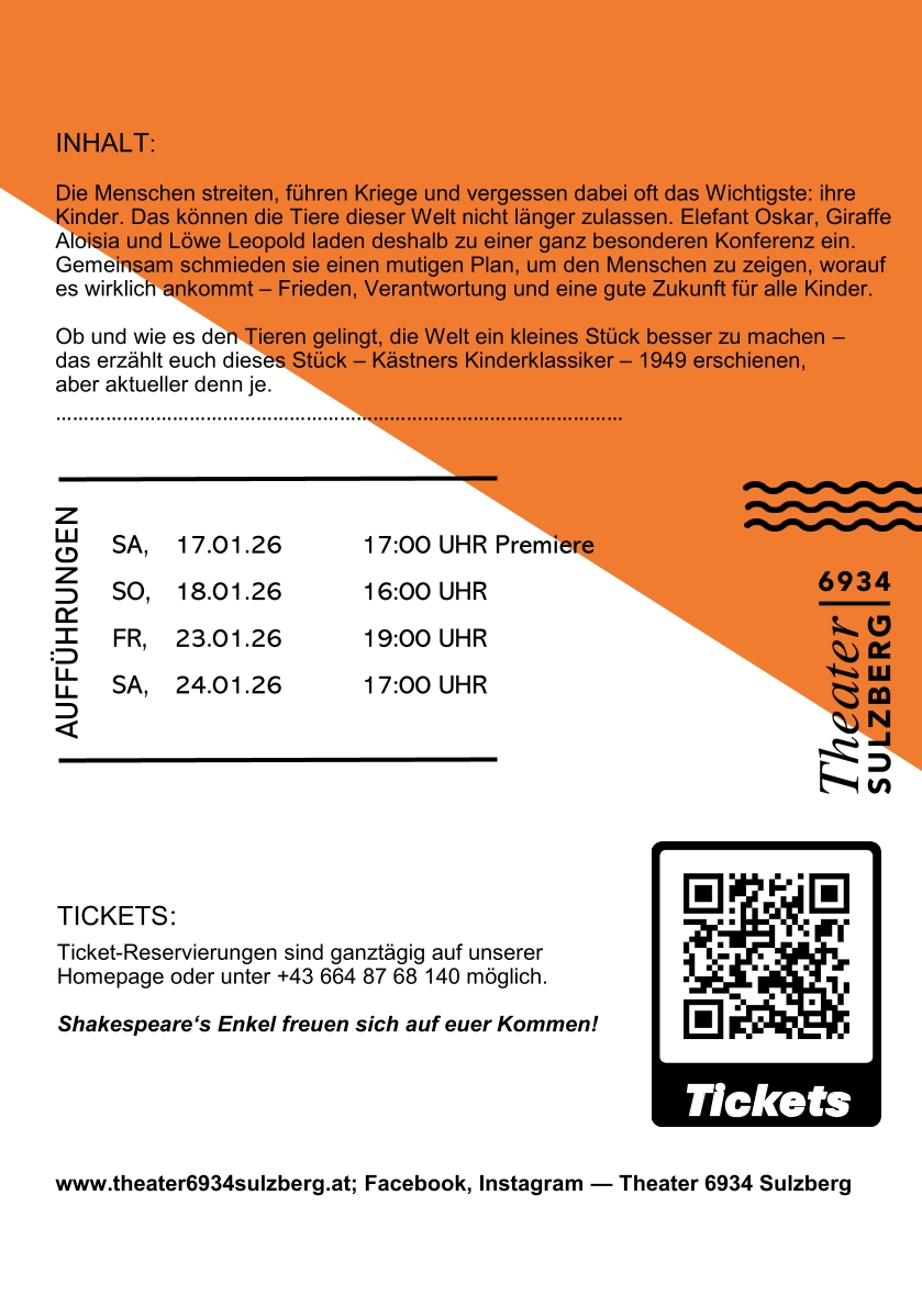 Mit einer erfolgreichen und sehr gut besuchten Premiere präsentierte die Theatergruppe Shakespeare’s Enkel vergangenen Samstag in Sulzberg ihr neues Stück „Die Konferenz der Tiere“. Viele Kinder und Erwachsene waren der Einladung gefolgt und erlebten einen Theaterabend, der gleichermaßen begeisterte, berührte und zum Nachdenken anregte.