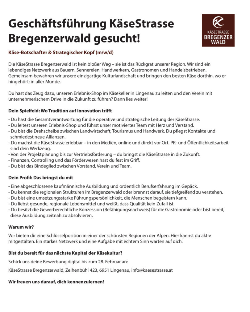NEWS • STELLENANGEBOTE Geschäftsführung KäseStrasse Bregenzerwald gesucht 5 Stunden altKommentar hinzufügen41 Klicks FacebookXGoogle+PinterestLinkedIn