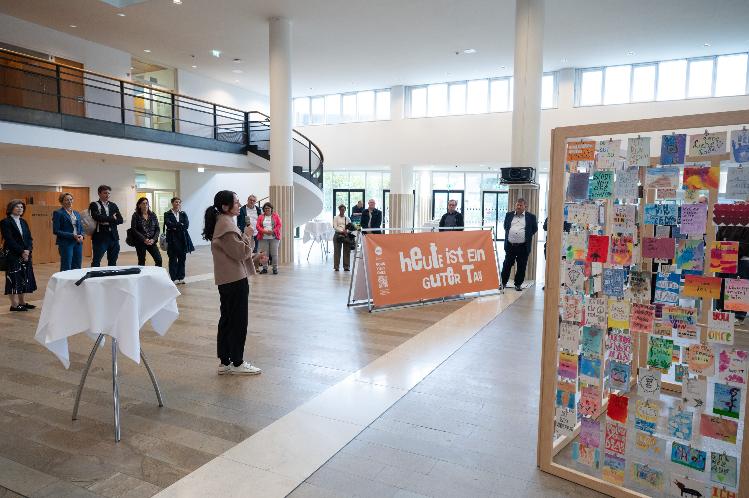 Am 13. Oktober 2025 eröffnete die Offene Jugendarbeit Bregenzerwald (OJB) im Foyer des Landhauses die Ausstellung “GOOD VIBES ONLY”. Die Ausstellung ist dort bis einschließlich 23. Oktober 2025 öffentlich zugänglich und lädt Besucher*innen ein, in eine Welt stärkender Botschaften und kreativer Ausdrucksformen einzutauchen.