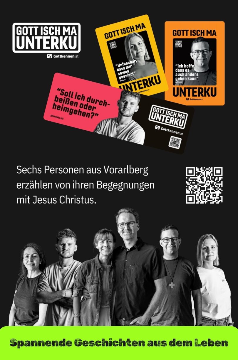 Im ganzen Ländle weisen Plakate, Kinotrailer, sowie Youtube- und Social-Media-Werbung auf die Kampagne „Gott isch ma unterku“ hin. Darin erzählen sechs Menschen aus Vorarlberg von ihren spannenden Begegnungen mit Jesus Christus.