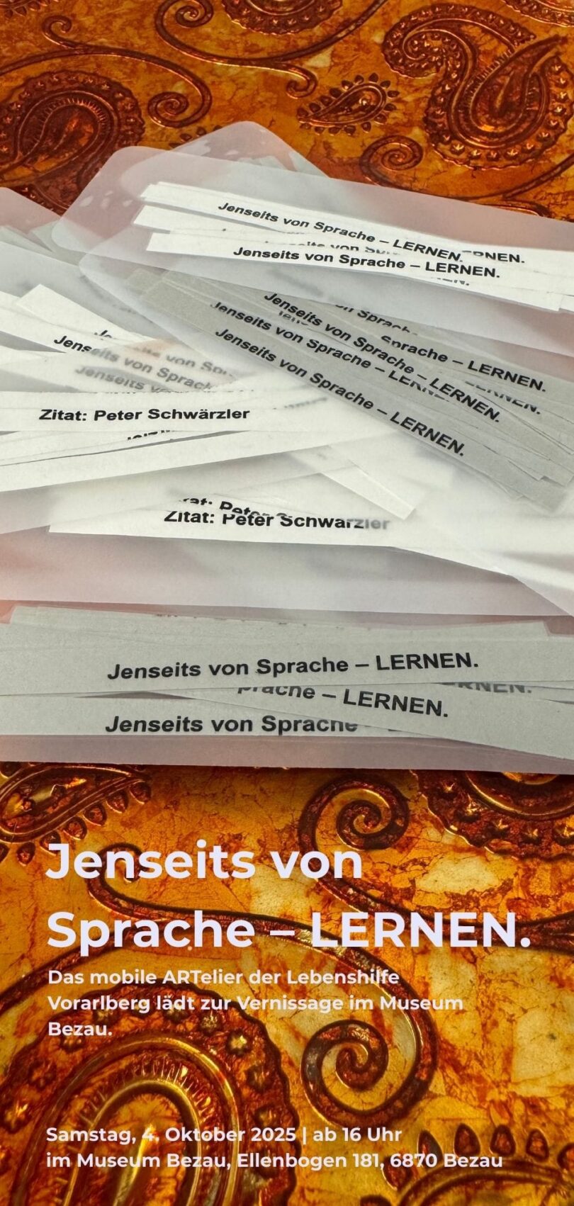 Im Rahmen der „Langen Nacht der Museen“ am 4. Oktober lädt das mobile ARTelier zur feierlichen Vernissage unter dem Titel „Jenseits von Sprache – LERNEN.“ ein. Gezeigt werden beeindruckende Werke von Martin Bischof, Jürgen Denz, Hildegard Greußing, Michael Metzler, Beate Ritter, Peter Schwärzler, Notburga Willi und Markus Wüstner.