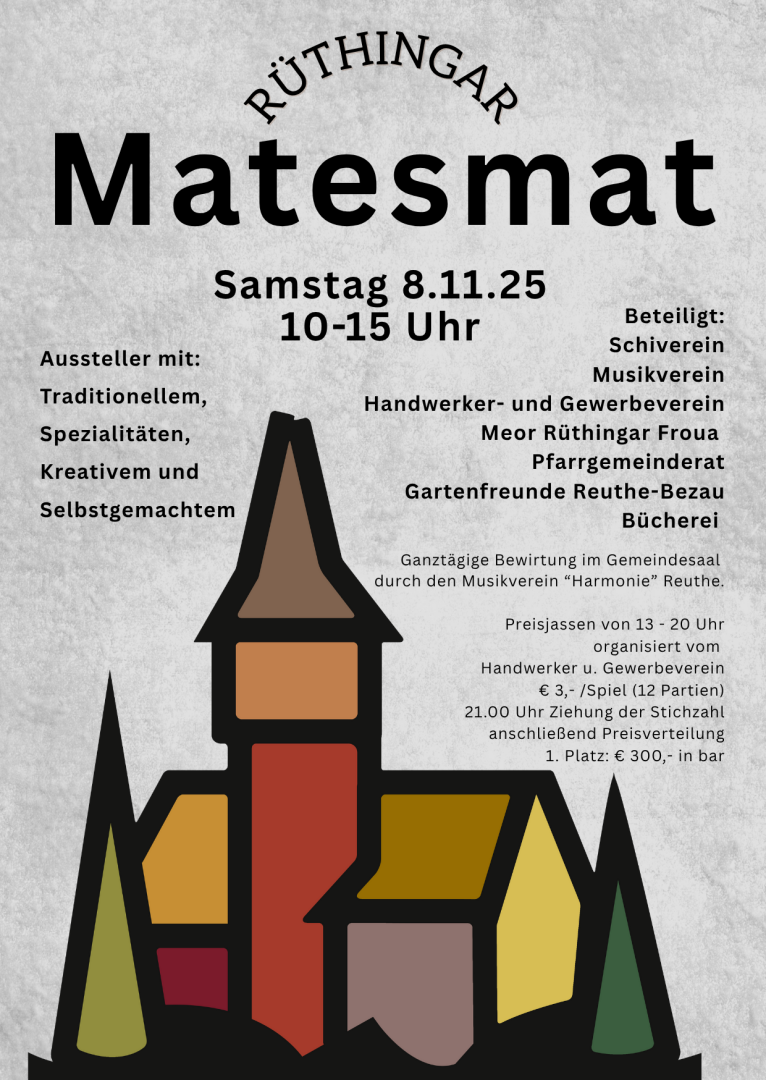 Am Samstag, den 08.11.2025 findet der traditionelle Matesmat in Reuthe statt. Auf dem Markt präsentieren von 10 – 15 Uhr heimische Aussteller kreatives Kunsthandwerk und Selbstgemachtes. Bei den beteiligten Vereinen gibt es wieder kulinarische Köstlichkeiten.