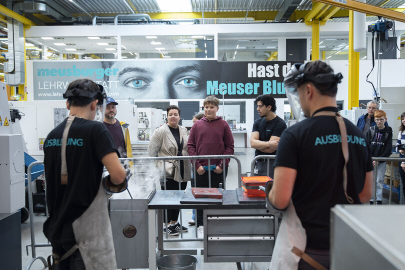 Das Erfolgsrezept: ausprobieren statt nur zuschauen. An mehreren Stationen konnten die Jugendlichen selbst Werkstücke fertigen und so die Präzision der Zerspanungstechnik selbst erleben. Bei geführten Rundgängen durch die moderne Lehrwerkstatt gaben AusbilderInnen und Lehrlinge Einblicke in den Alltag bei Meusburger.