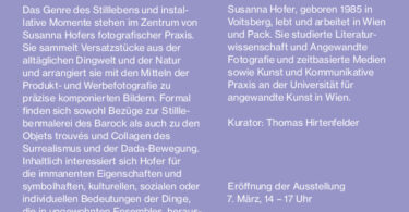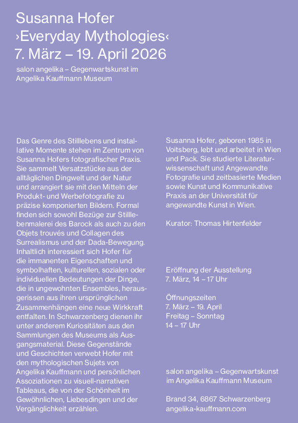Das Genre des Stilllebens und installative Momente stehen im Zentrum von Susanna Hofers fotografischer Praxis. Sie sammelt Versatzstücke aus der alltäglichen Dingwelt und der Natur und arrangiert sie mit den Mitteln der Produkt- und Werbefotografie zu präzise komponierten Bildern. Formal finden sich sowohl Bezüge zur Stilllebenmalerei des Barock als auch zu den Objets trouvés und Collagen des Surrealismus und der Dada-Bewegung. Inhaltlich interessiert sich Hofer für die immanenten Eigenschaften und symbolhaften, kulturellen, sozialen oder individuellen Bedeutungen der Dinge, die in ungewohnten Ensembles, herausgerissen aus ihren ursprünglichen Zusammenhängen eine neue Wirkkraft entfalten. In Schwarzenberg dienen ihr unter anderem Kuriositäten aus den Sammlungen des Museums als Ausgangsmaterial. Diese Gegenstände und Geschichten verwebt Hofer mit den mythologischen Sujets von Angelika Kauffmann und persönlichen Assoziationen zu visuell-narrativen Tableaus, die von der Schönheit im Gewöhnlichen, Liebesdingen und der Vergänglichkeit erzählen.