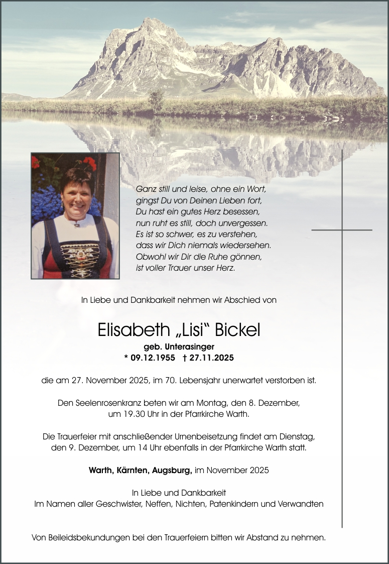 TODESANZEIGEN Traueranzeige Frau Elisabeth “Lisi” Bickel Warth 2 Tagen altKommentar hinzufügen154 Klicks FacebookXGoogle+PinterestLinkedIn