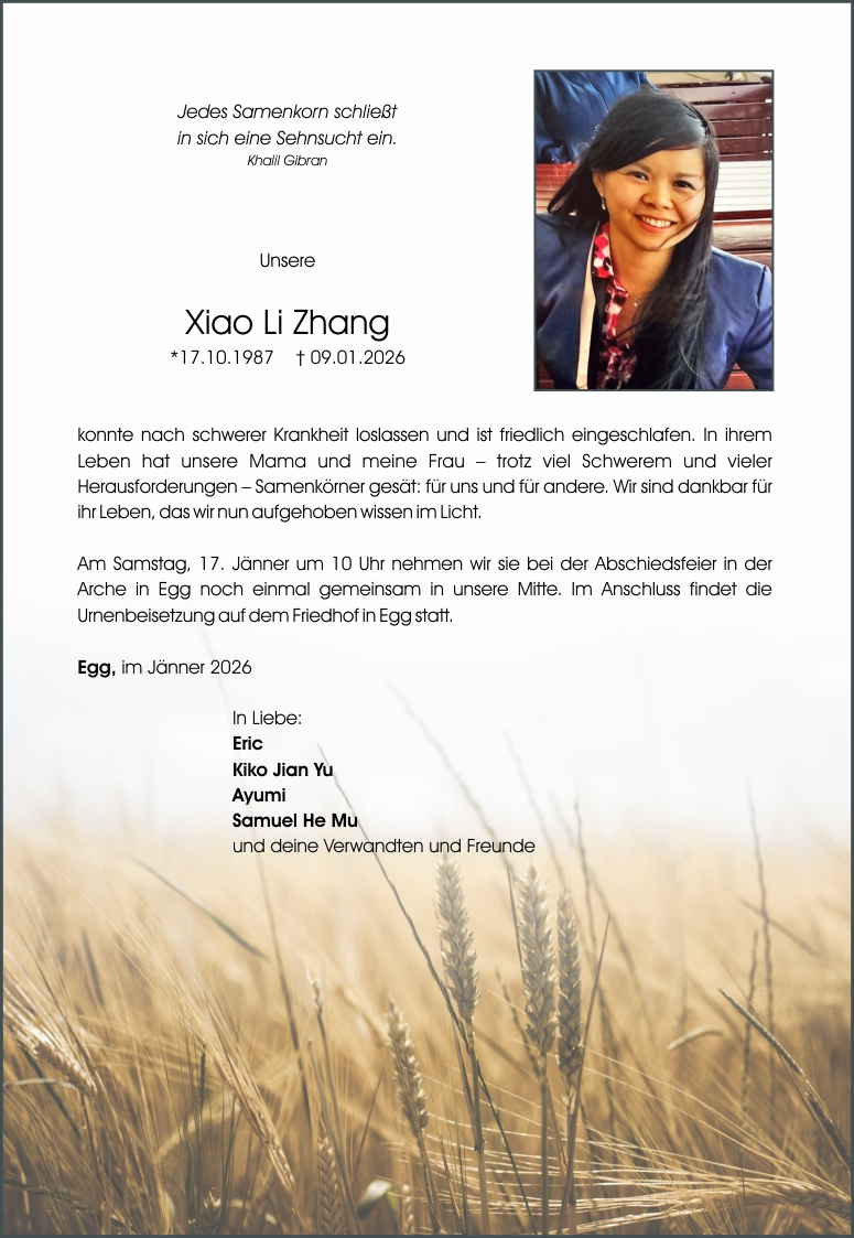 NEWS • TODESANZEIGEN Traueranzeige Frau Xiao Li Zhang Egg 3 Wochen altKommentar hinzufügen510 Klicks FacebookXGoogle+PinterestLinkedIn