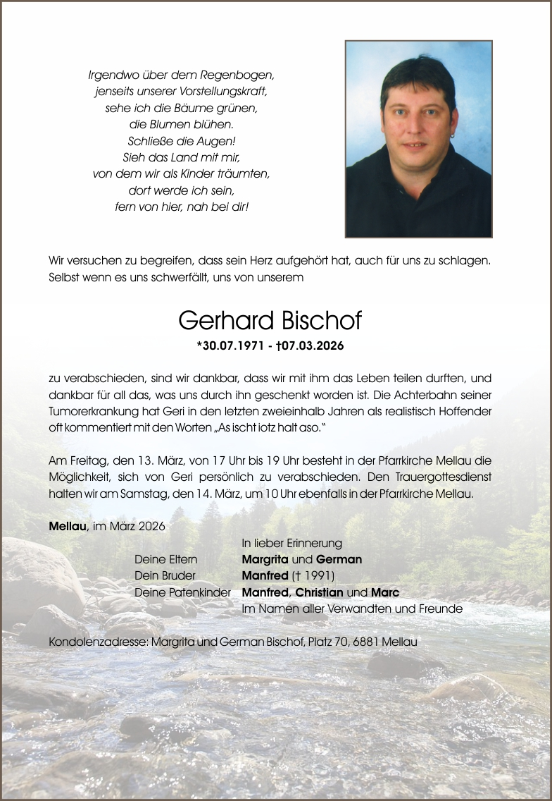 NEWS • TODESANZEIGEN Traueranzeige Herr Gerhard “Geri” Bischof Mellau 12 Stunden altKommentar hinzufügen149 Klicks FacebookXGoogle+PinterestLinkedIn