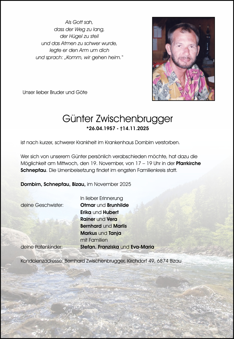 TODESANZEIGEN Traueranzeige Herr Günter Zwischenbrugger Bizau 2 Tagen altKommentar hinzufügen175 Klicks FacebookXGoogle+PinterestLinkedIn