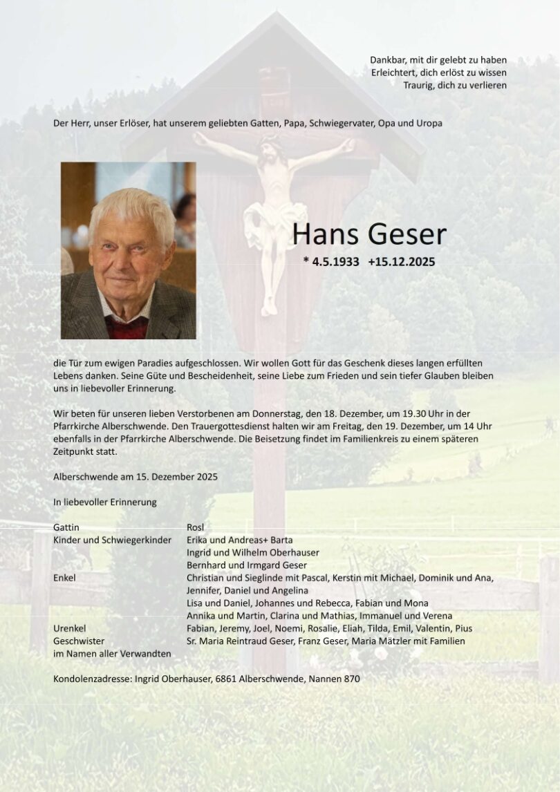 TODESANZEIGEN Traueranzeige Herr Hans Geser Alberschwende 2 Monaten altKommentar hinzufügen127 Klicks FacebookXGoogle+PinterestLinkedIn