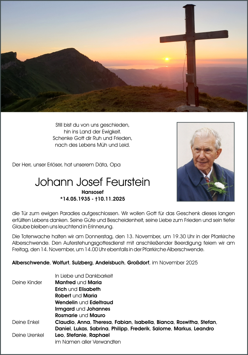 TODESANZEIGEN Traueranzeige Herr Johann Josef Feurstein 6 Monaten altKommentar hinzufügen279 Klicks FacebookXGoogle+PinterestLinkedIn