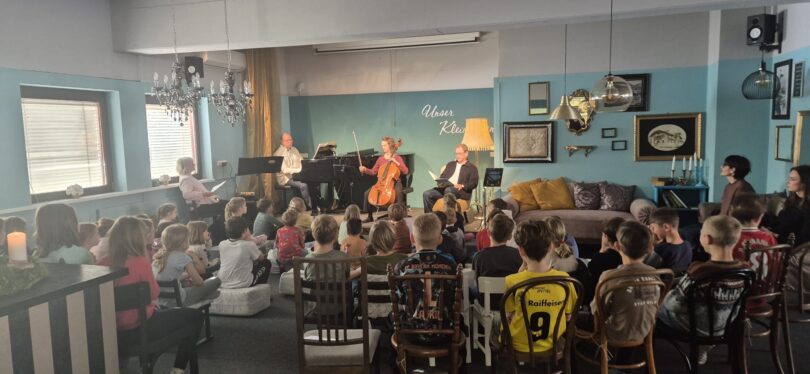 Wolfgang Bilgeri hat das Buch in der Hand und liest die Geschichte vor – und er tut das so fröhlich und mit Schalk in Augen und Stimme, dass man dem eigentlichen Posaunisten noch gerne länger zuhören möchte. Ergänzt wird seine „Lesung“ von einem kongenialen Trio: Angelika Gallez (Flöte), Martin Gallez (Klavier) und Iza van Holen (Cello) haben für die verschiedenen Empfindungen und Stationen des Friedolin Vogel passende Stücke von namhaften Komponisten von Franz Schubert und Carl Maria von Weber über Dmitri Schostakowitsch bis hin zu John Rutter oder Arvo Pärt ausgesucht und unterstützen damit die Geschichte so fein und so fühlig, dass es eine Wohltat ist, diesem Gesamtkunstwerk zu lauschen.