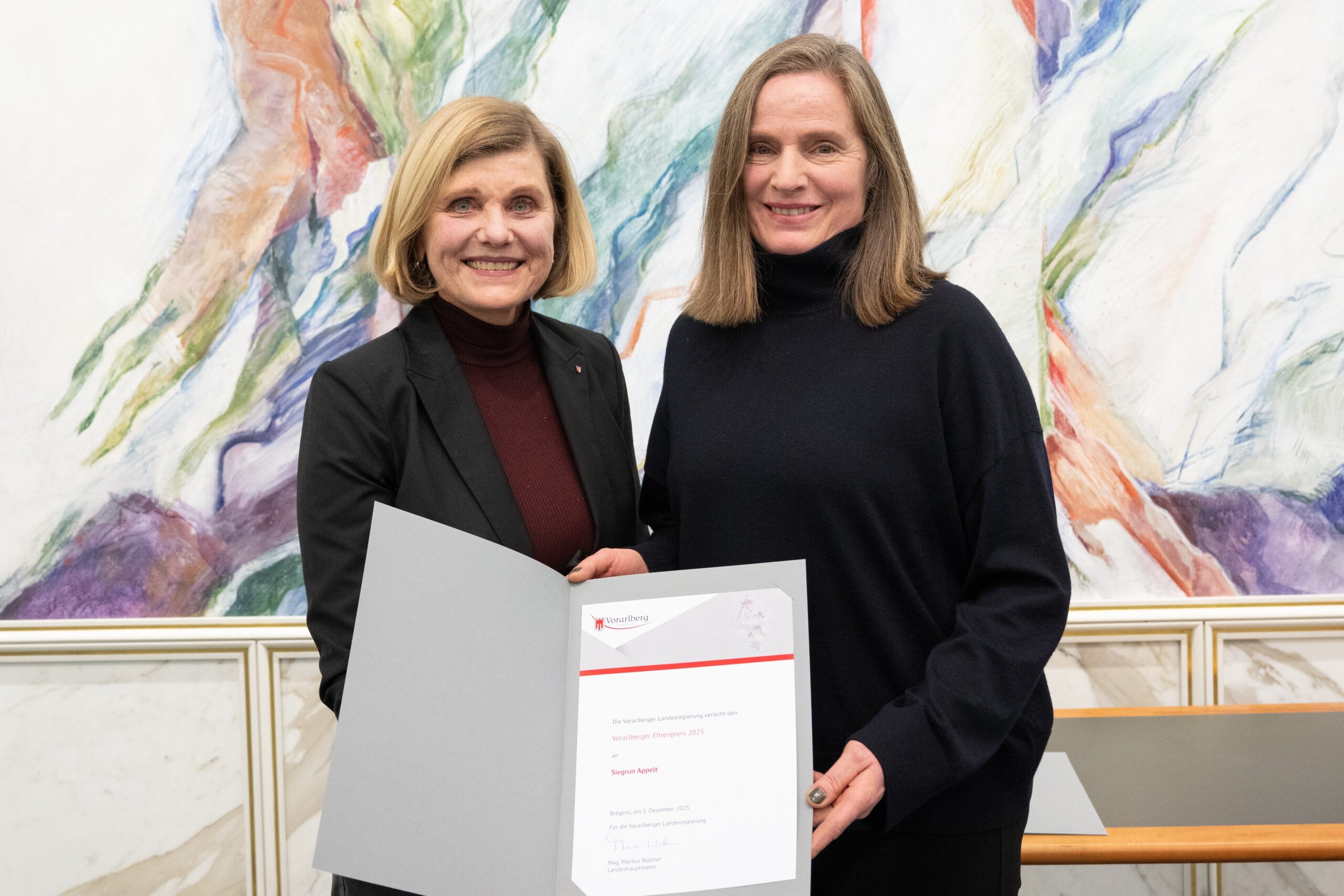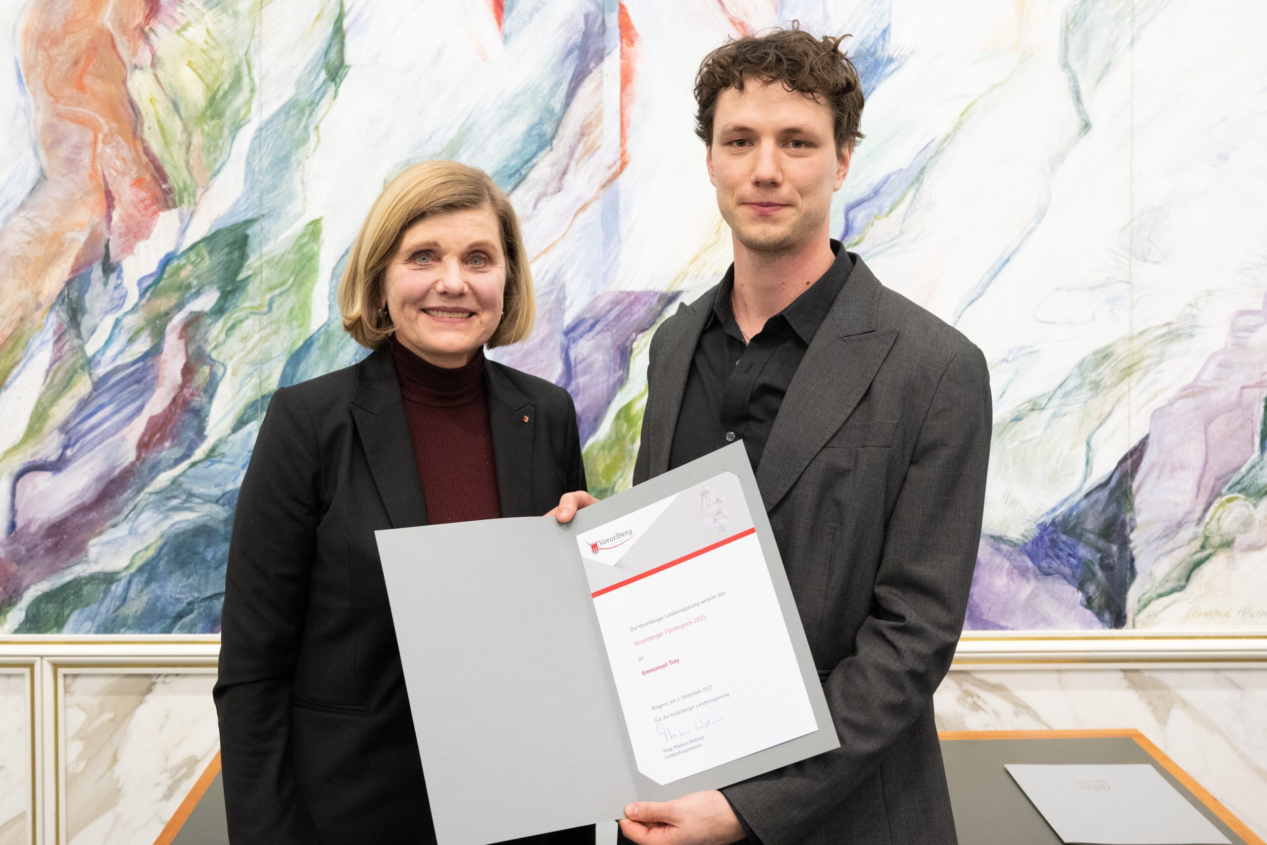 Um die Leistungen von etablierten als auch von aufstrebenden Vorarlberger Kunst- und Kulturschaffenden zu würdigen, verleiht das Land Vorarlberg alljährlich je zwei Ehren- und zwei Förderpreise. Traditionell werden diese Preise auf Vorschläge aus den jeweiligen Kunstkommissionen zuerkannt. Am Montag, 1. Dezember 2025, überreichte Landesrätin Barbara Schöbi-Fink im Rahmen einer Feier im Montfortsaal die heurigen Ehrenpreise zu je 5.000 Euro an die Foto- und Medienkünstlerin Siegrun Appelt und den Musiker Guy Speyers sowie die Förderpreise zu je 2.500 Euro an die Musikerin Johanna Bilgeri und den Bildenden Künstler Emmanuel Troy.