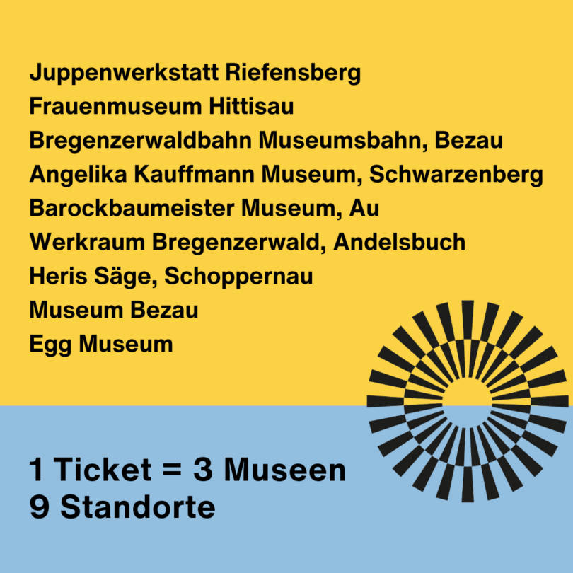 Mit dabei sind in diesem Jahr die Juppenwerkstatt Riefensberg, der Werkraum Bregenzerwald Andelsbuch, das Angelika Kauffmann Museum in Schwarzenberg, das Barockbaumeistermuseum Au, das Museum Bezau, die Bregenzerwaldbahn Museumsbahn Bezau, das Frauenmuseum Hittisau, das Egg Museum sowie Heris Säge in Schoppernau.